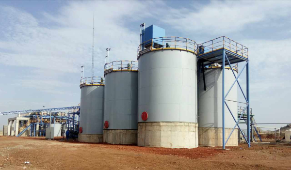 The slurry will enter into 8 sets of double impeller leaching tank; well-mixed sodium cyanide agents are added to the first tank; active carbon is added to the tanks from the second to the eighth; active carbon from the second agitator is lifted to carbon screen to get gold-loaded carbon, and after cleaning, the gold-loaded carbon enters into the desorption&electrolysis system; while the slurry left goes back to the second tank; active carbon is lifted by air lifter from the tank next to the tank before against the current; the tailing goes through safety screen to recycle fine-size gold-loaded carbon, and then goes to tail water treatment stage.