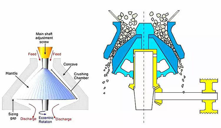 When the cone crusher is working, the motor drives the eccentric bearing bushing via spring coupling, transmission shaft and a couple of cone gear wheel. The crushing cone axis is forced to swing by the eccentric bearing bushing, which makes the mantle sometimes close to the bowl liner, and some times far away from the bowl liner. The raw materials are pressed, impacted and finally crushed in the crushing chamber.