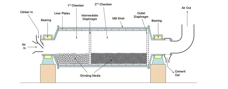 The ball mill is horizontal cylindrical rotation device, driving by brim gearwheel, there are two chambers and grid. Material goes into the first chamber of the ball mill through the feeding inlet, inside the first chamber, there are stage liners and ripple liners as well as steel balls with various kinds.The shell rotates brings balls to a certain height and then balls drop down by gravity, which will impact and grind the material. Then material goes into the second chamber through segregate screen, in the second chamber, there are fiat liners and steel balls, after the secondary grinding, material is discharged through the discharge screen of the ball mill.