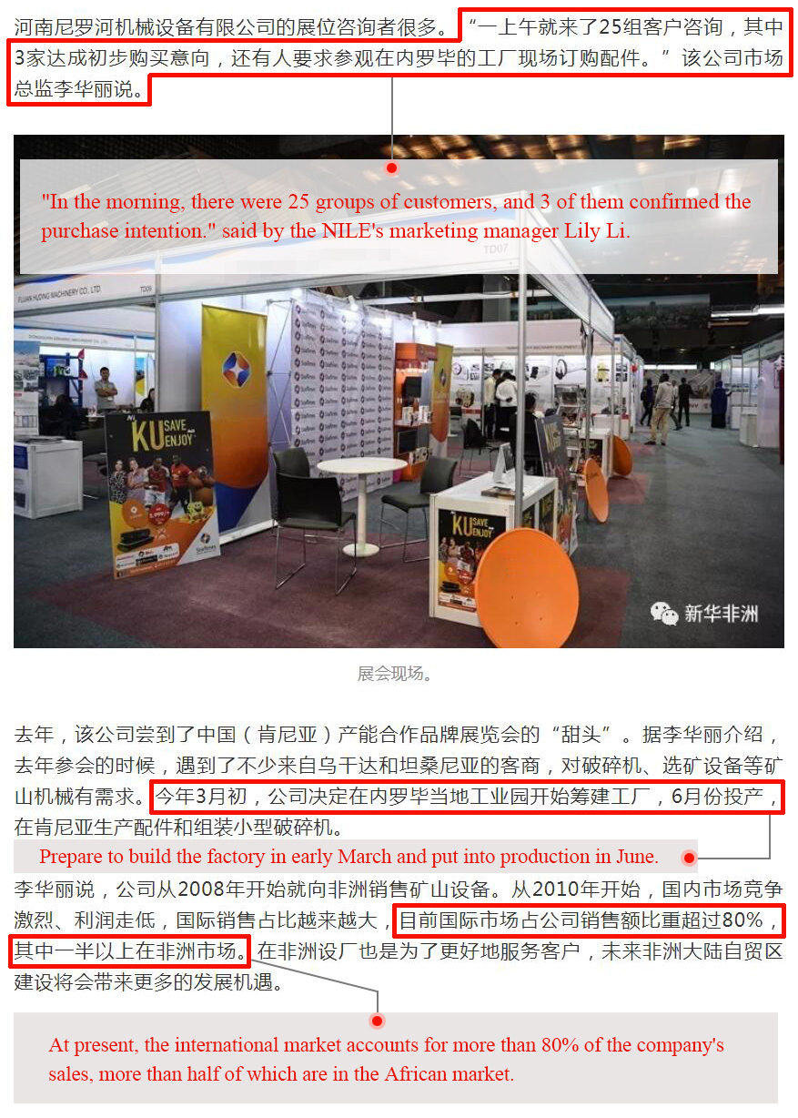 On the first day of the exhibition, our company had a lot of booth consultants and accepted live interviews from Xinhua News Agency, they also made a special report on the development of the Nile Machinery Company in Kenya.