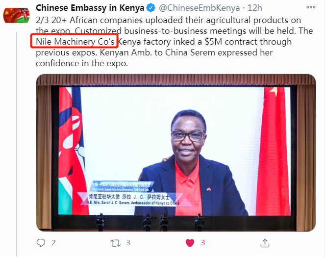 20+ African companies uploaded their agricultural products on the expo. Customized business-to-business meetings will be held. The Nile Machinery Co's Kenya factory inked a $5M contract through previous expos. Kenyan Amb. to China Serem expressed her confidence in the expo.